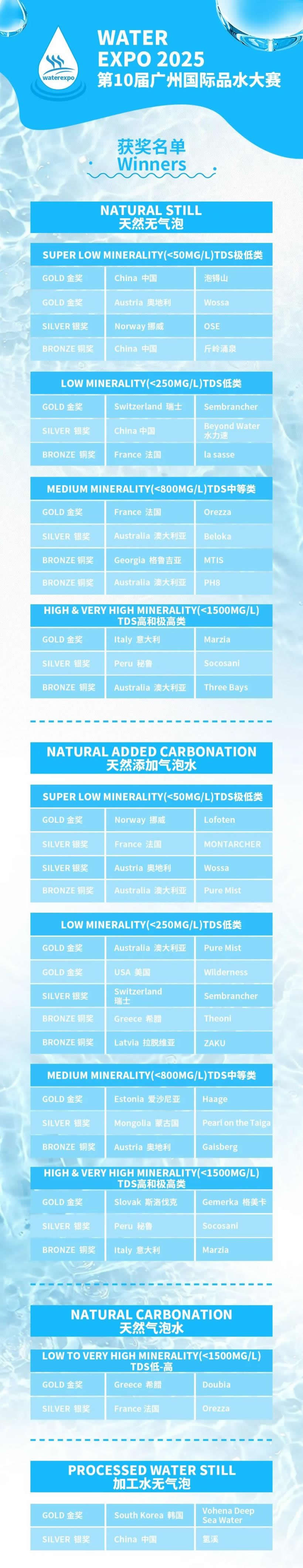 经过6月12日上午的品鉴与打分环节,大赛在13日上午举办隆重的颁奖典礼,为获奖企业颁发荣誉证书。其中获得金奖的品牌有:中国的泡锝山、瑞士的Sembrancher、法国的Orezza、意大利的Marzia、挪威的Lofoten、澳大利亚的Pure Mist、美国的Willderness、爱沙尼亚的Haage、斯洛伐克的Gemerka格美卡、希腊的Doubia、韩国的Vohena Deep Sea Water。